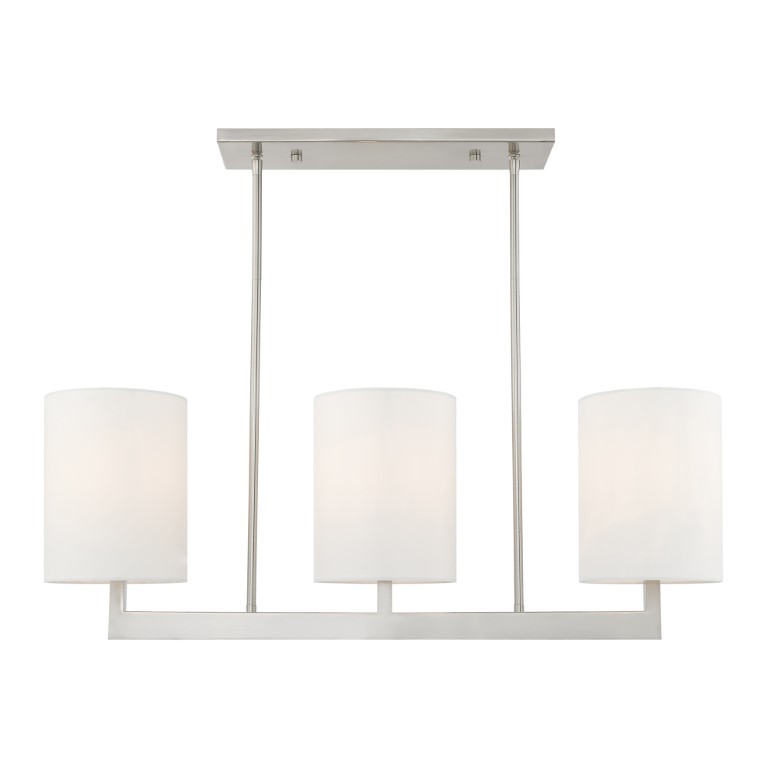 Raise the style bar with a designer linear chandelier in a handsome and versatile contemporary manner. This three light linear chandelier comes in a brushed nickel finish with round off-white fabric hardback shade.