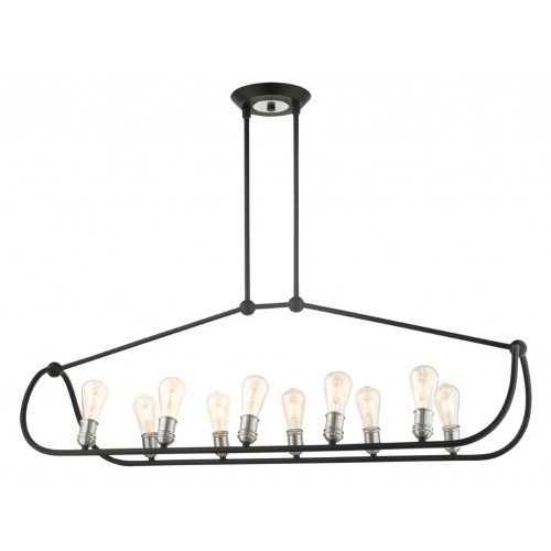 Get into the heart of the matter with the Archer collection. Industrial, urban and stylish, its graphic lines will emphasize the airy flow of a contemporary loft interior. The wrought iron is finished in black and is combined with brushed nickel accents. It pairs perfectly with Edison style type bulbs. This dramatic ten light linear chandelier will float weightlessly over a butcher block countertop or reclaimed wood dining table.