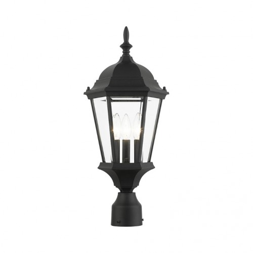 The elegant silhouette of the Hamilton collection is a classic that is sure to please even the most discriminating taste. This outdoor three-light medium post top lantern features a decorative top and finial which are paired with a simple six-sided frame in this textured black finish with clear beveled glass. Constructed of cast aluminum, this durable exterior fixture looks best in traditional or transitional outdoor settings.