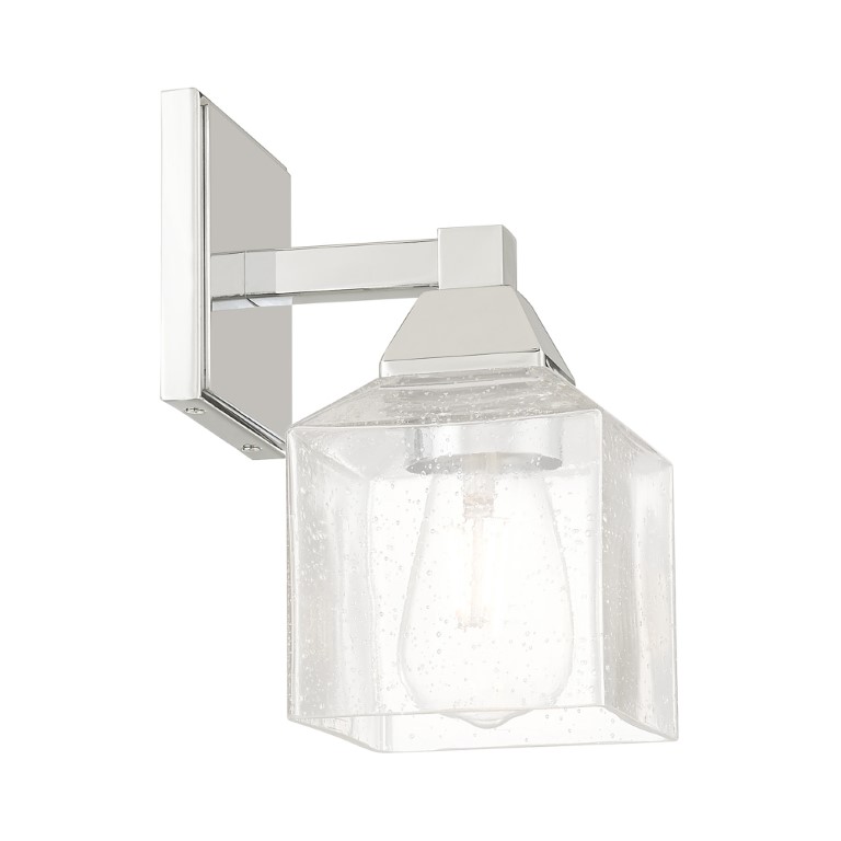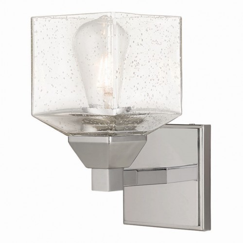 This wall sconce is sure to provide reliable illumination without sacrificing style. It features one clear seeded glass shade with an open bottom, exposing the bulb inside. A polished chrome finish covers the backplate and accents the light.