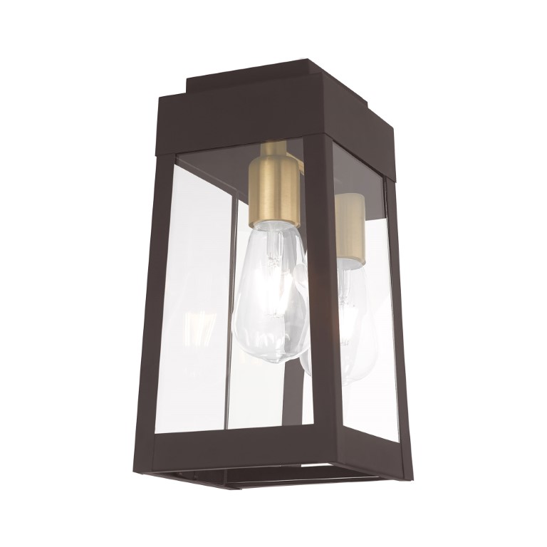 This updated industrial design comes in a tapering solid brass bronze frame with a sleek, straight-lined look and features clear glass panels.