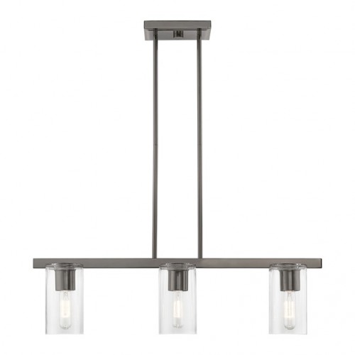 The Clarion transitional three light linear chandelier will bring posh sophistication to your decor. The angular frame and clear cylinder glass give this black chrome finish a sleek, contemporary look.