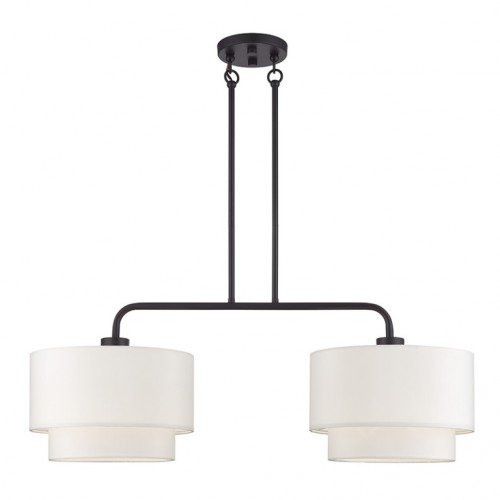 The Manorwood collection has a clean, crisp look and modern appeal. The hand-crafted off white colored fabric hardback double drum shades offer a diffused warm light complementing the bronze finish on this sleek two light linear chandelier. Will adapt well in the living room, dining room and over the kitchen island tastefully elevating your style.