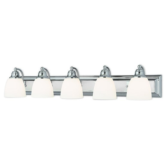 Bring a beautiful new look to your bathroom or vanity area with this charming six light bath fixture. A wide rectangular backplate in bronze finish supports six simple arms that hold six glass shades in hand blown satin opal white glass.